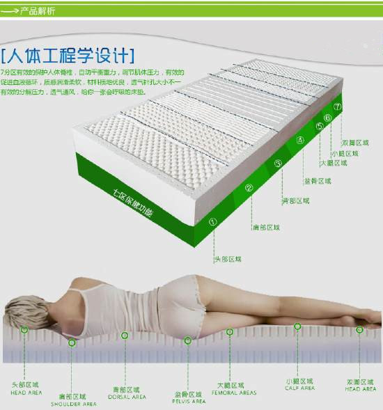 乳膠床墊分區(qū)上面主要是3、5、7。數(shù)字代表的意思是,一張乳膠床墊,分成幾個(gè)軟硬程度不同的區(qū)域。之所以要有分區(qū)的概念,是配合人體頭、肩、背、腰、臀、腿、腳七個(gè)部位不同著力的要求設(shè)計(jì)的,以獲得更好的身體貼合性。更貼合身體的乳膠床墊,能夠在睡眠中提供各個(gè)部位恰到好處的支撐,從而達(dá)到更好的緩解肌肉緊張的左右,并且讓睡眠更加舒適。所以,現(xiàn)在很多人,尤其是側(cè)睡的人會(huì)購買7區(qū)的乳膠床墊。