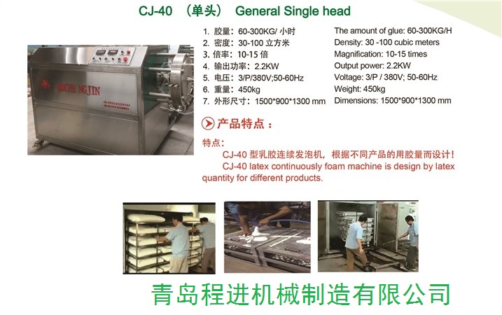 CJ-40型乳膠連續(xù)發(fā)泡機適用于乳膠枕、U型枕、乳膠腳墊,乳膠坐墊等乳膠產品注模加工工藝生產需要。