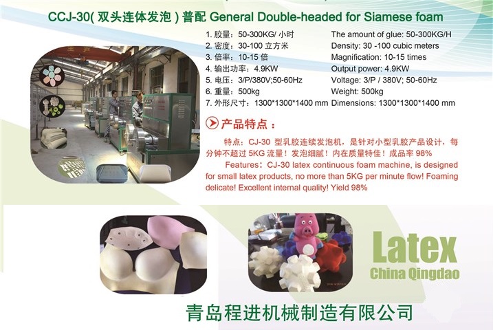 CCJ-30型連續(xù)乳膠發(fā)泡機是針對小型乳膠產(chǎn)品設(shè)計,適應(yīng)于流水線作業(yè),不間斷連續(xù)工作,適合乳膠鞋墊,乳膠文胸,乳膠玩具的流水線生產(chǎn)需要。