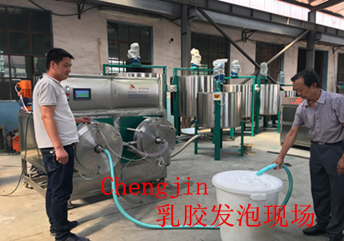 總的來說是將天然乳膠灌入機器內(nèi),經(jīng)過一系列發(fā)泡工藝出成品乳膠。具體操作首先是將天然乳膠配方原料投入乳膠發(fā)泡機內(nèi),其次將機械打開操作,一開始發(fā)出的泡沫比較稀薄,需要等待一段時間后查看產(chǎn)品是否變粘稠性,若是說明已經(jīng)發(fā)泡好,若不是需要重新再走一遍回程。最后將發(fā)泡好的產(chǎn)品灌入相應的設備模具??雌饋肀容^簡單,最主要的在于工藝和配方。下圖是乳膠發(fā)泡的現(xiàn)場圖片。