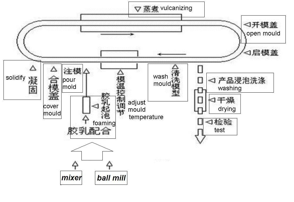 首先會(huì)將天然乳膠和小料混合 就是圖中的膠乳配合 通過攪拌和球磨的方式,配合好后通過乳膠發(fā)泡機(jī)進(jìn)行起泡。發(fā)泡后的液體注入相應(yīng)的模具,蓋上模具蓋子,等待凝固。通過流水線將模具送入蒸煮硫化箱。進(jìn)行硫化蒸熟。硫化時(shí)間通常20-30分鐘,蒸熟后的產(chǎn)品將其從模具中分離出來。通過水洗機(jī)進(jìn)行清洗,去除雜質(zhì)。一部分客戶可以自行選擇浸泡洗滌,但是洗滌效果不是很好,通過專用的水洗機(jī)清洗的可以通過滾壓,擠壓的方式將乳膠中的雜質(zhì)清洗干凈,這樣就不會(huì)像普通浸泡那樣了。清洗后的產(chǎn)品進(jìn)入烘箱進(jìn)行烘干打包。最后出產(chǎn)品檢驗(yàn)打包就可以了,乳膠制品的基本的生產(chǎn)流程圖就是這樣的。大家可以看上圖比較直觀一些。